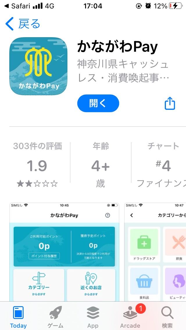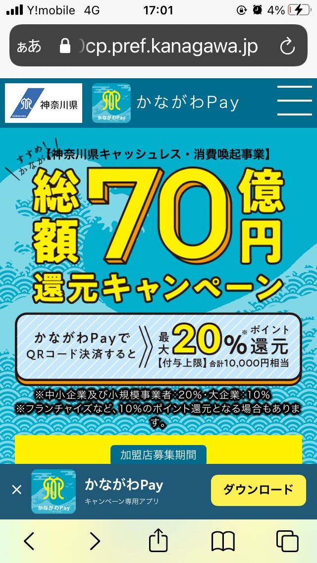 まずは画面下部に出てきた、「かながわPay」というアプリのダウンロードをします。