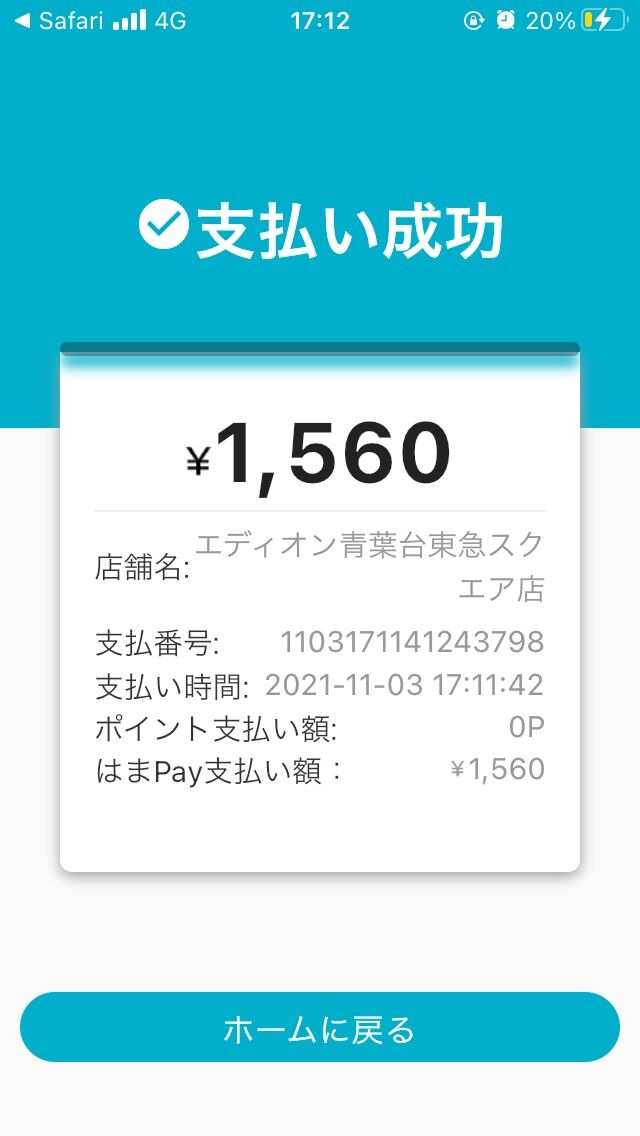 私はかながわPAYのアプリの読み取りボタンを押して、そのQRコードを読み取り、金額を打ち込み、はまPAYで支払いを選択しました。するとはまPAYのアプリに勝手に移動して、パスワードを打ち込むと支払いが完了しました!!